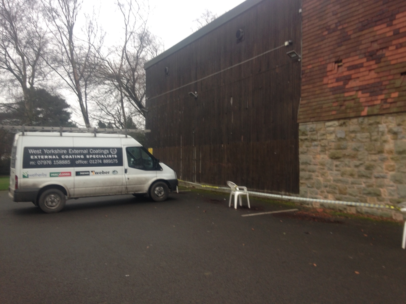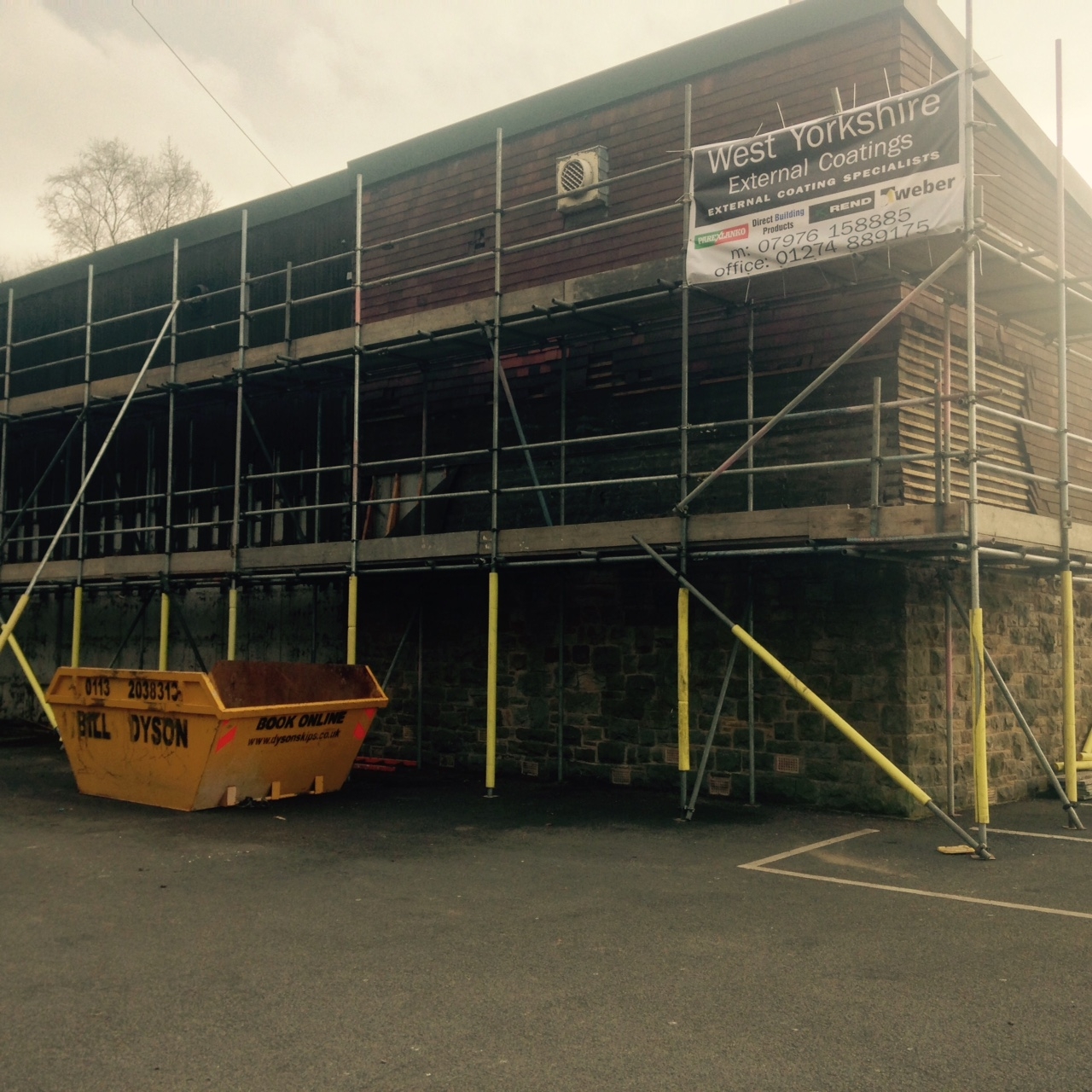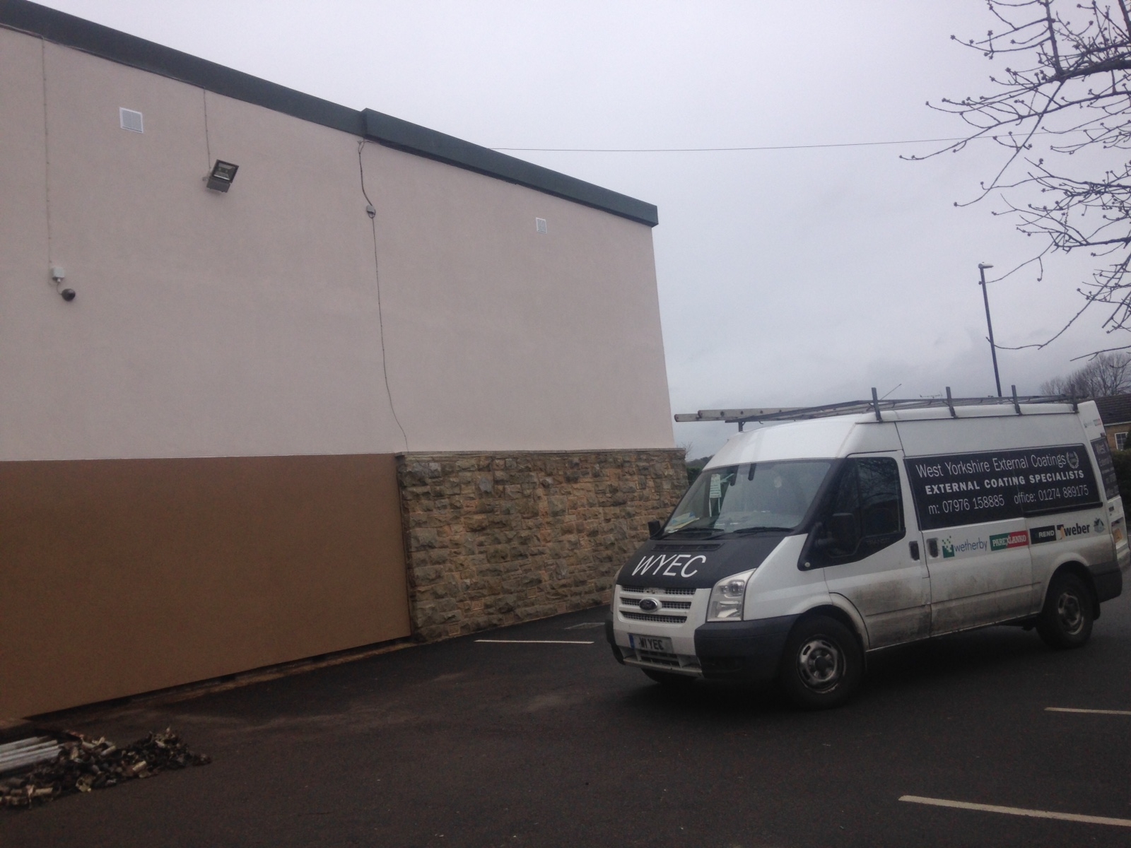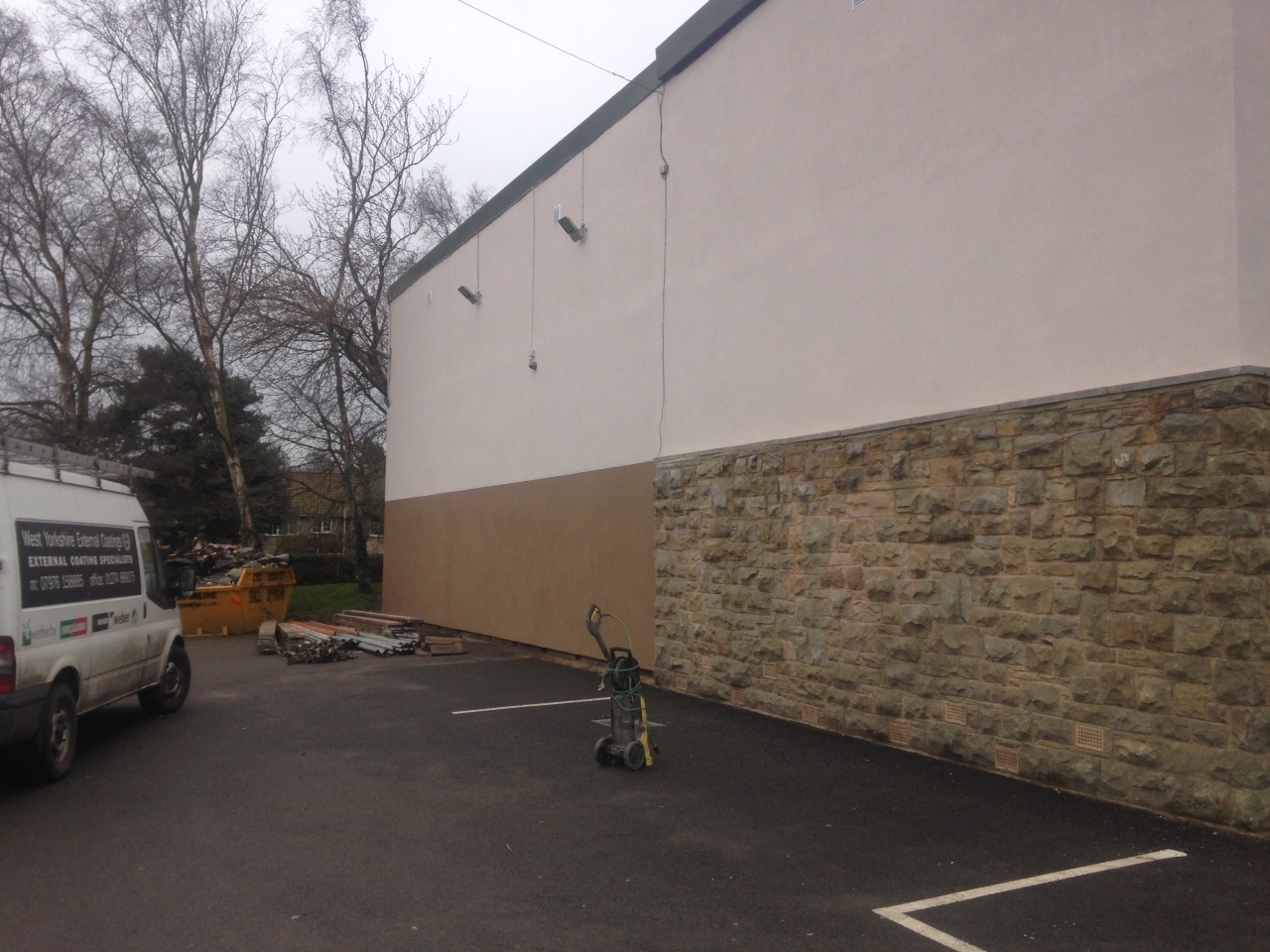 High quality silicone rendering work on Collingham Sports Club, Leeds, West Yorkshire. We first insulated the walls followed by a polymer mesh undercoat and then a coat of primer followed by colour waterproof silicone render.